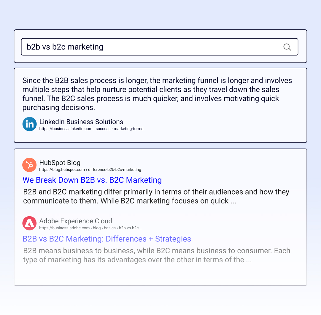 Authoritative, keyword-rich pages are served near the top of the results, along with short snippets to answer certain questions faster.